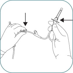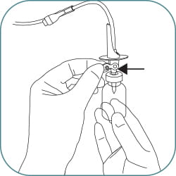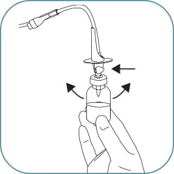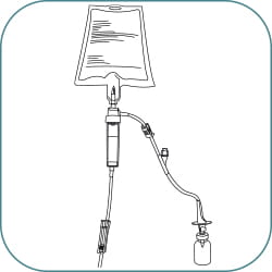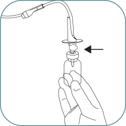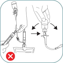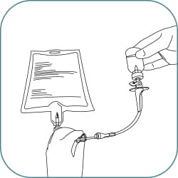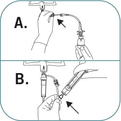 (A) Fill the drug vial by holding up the infusion bag and open the side clamp. Fill the drug vial half full, close the clamp or (B) attach a syringe to the needle free connector, fill the drug vial half full.